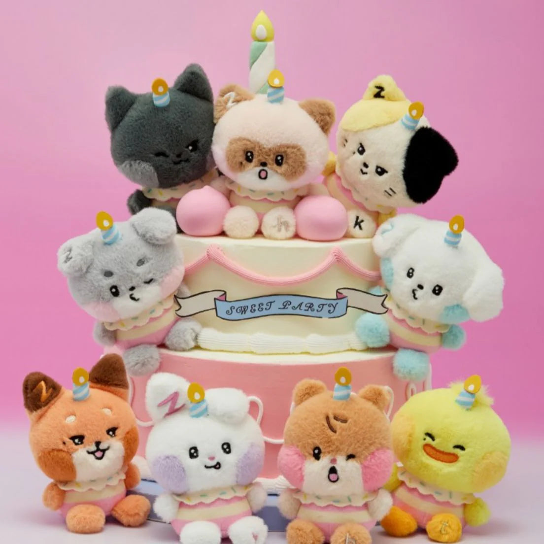 Bring the celebration home with the Sweet Party Plush Collection, the ultimate set of cuddly companions for every K-pop fan! Each plush is dressed in adorable party outfits, topped with a tiny birthday candle hat 🎉, and ready to brighten up your shelf, desk, or collection corner.